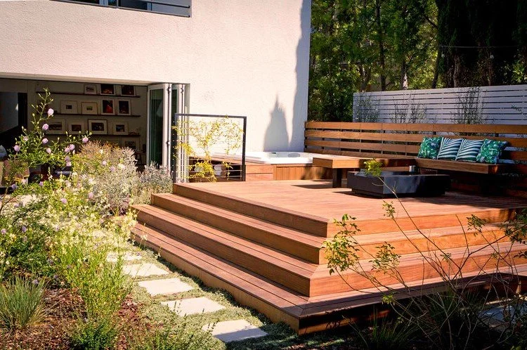 8. Step things down. For hillier sites, a series of garden terraces may be the way to go. Stair-stepping the water down the slope will help prevent erosion. It will also give you a way to showcase your prized plants.